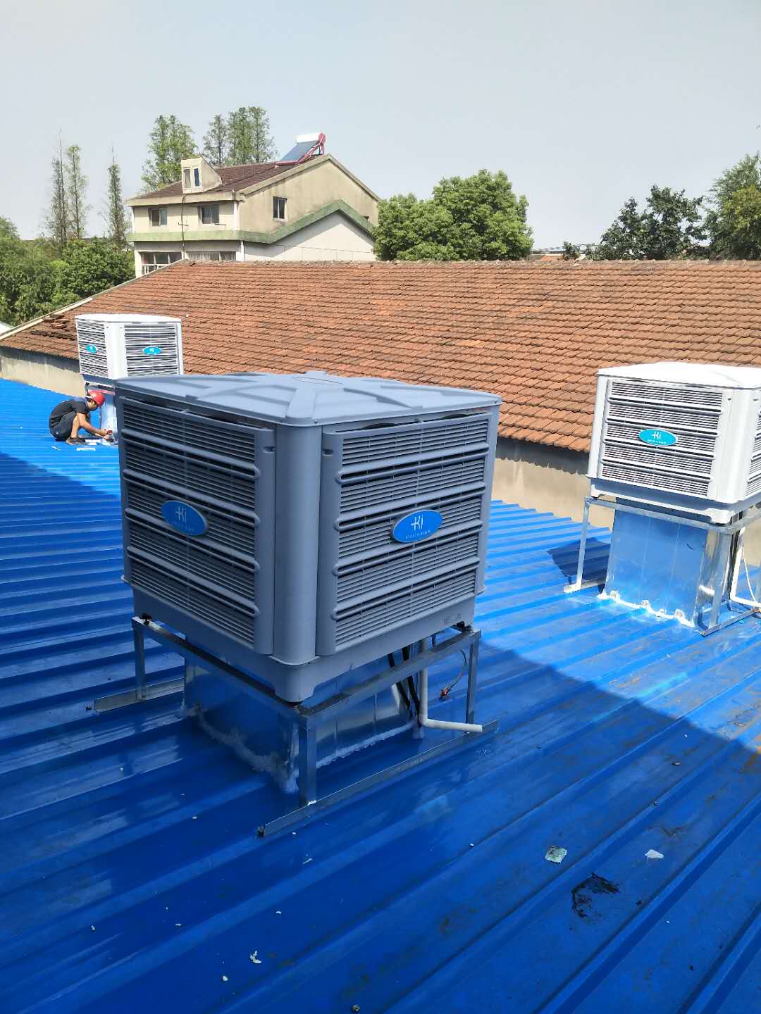 鋼結構鐵皮廠房是最近這幾年興建的最多的廠房,因為鋼結構鐵皮廠房的性價比比較高,許多的工廠老板都搭建了鋼結構鐵皮廠房,因為成本對比混泥土廠房來說要實惠很多,但是鋼結構鐵皮廠房有一個弊端,就是夏天的時候非常悶熱,夏天鐵皮是吸熱的,室內非常的悶熱。鋼結構鐵皮廠房降溫是工廠老板比較頭疼的問題,給大家分享一些鋼結構鐵皮廠房用科瑞萊環保空調KD18整體降溫圖
